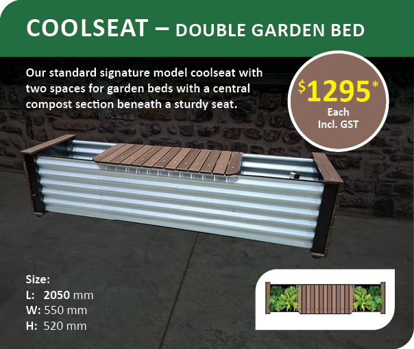 We wish to make the iconic garden, seat, and composter all in one more affordable and thus more accessible to a larger range of people, Coolseats designer and creator Michael Mobbs have reduced them to their factory prices. Prices have been reduced on both the single garden bed and double garden Coolseats designs, a total of $780 reduced and combined almost 24% price reduction on both products. Check out the different prices and functions below!